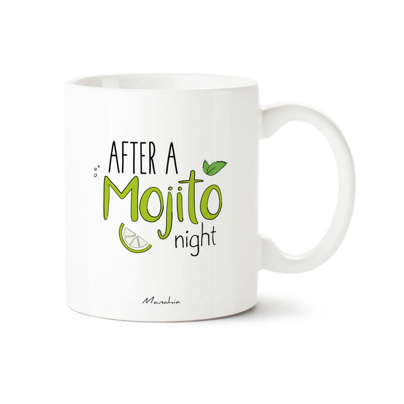 Pour celles et ceux qui aiment le mojito bien plus que le café, mais qui savent faire des pauses de temps en temps ^^ Diamètre : 8.00 cm Hauteur : 9.50 cm Contenance : 32 cl Mug en céramique Résistant au micro-ondes et au lave-vaisselle.
