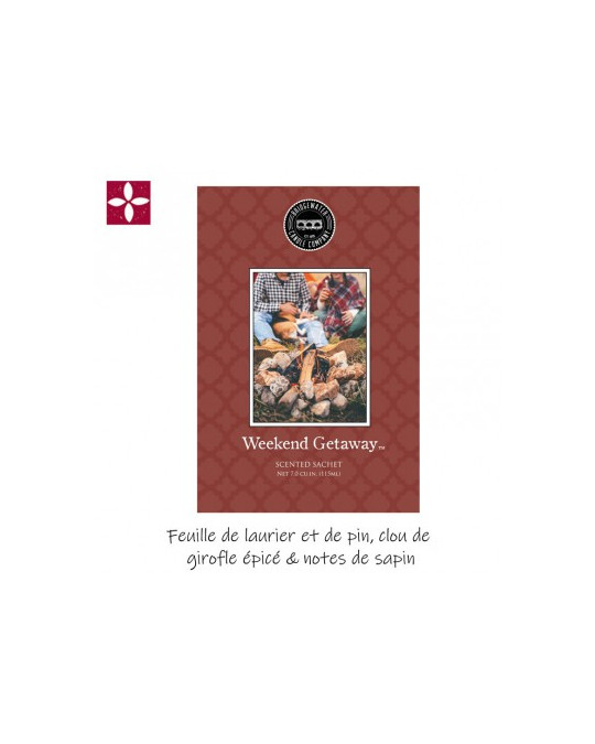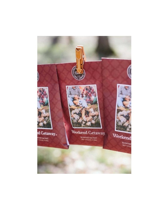 Le sachet parfumé Weekend Getaway libère une fragrance envoûtante mêlant des notes boisées, aquatiques et légèrement fruitées ( Feuille de laurier et de pin, clou de girofle épicé & notes de sapin) .