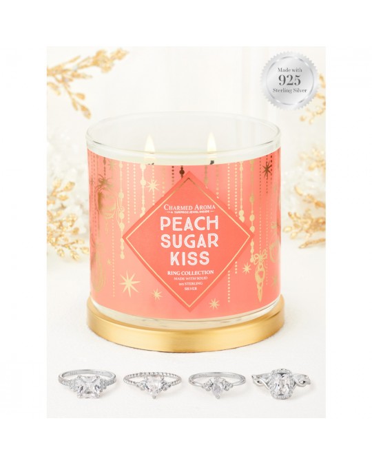 Pourtant, ce qui rend la bougie "Peach Sugar Kiss" de Charmed Aroma vraiment spéciale, c'est ce qui se cache à l'intérieur. Comme un trésor caché sous les feuilles vertes, une fois la cire fondue, un petit paquet se dévoile, renfermant un bijou étincelant. C'est comme si chaque bougie était une invitation à goûter à la douceur de l'été, une célébration de la beauté et de la générosité de la nature.