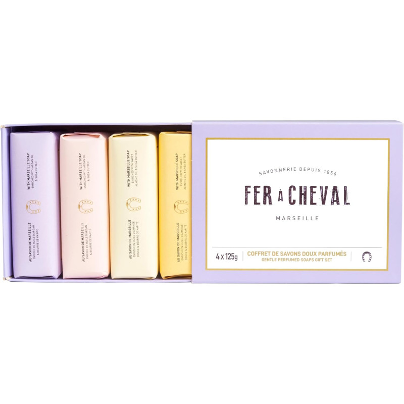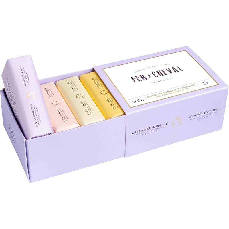 Retrouvez vos 4 savons parfumés préférés dans ce coffret. Fabriqué au savon de Marseille végétal, nous rajoutons ensuite à nos savonnettes du beurre de karité et des huiles adoucissantes (pour obtenir un savon surgras, doux pour la toilette ; ainsi qu’un peu de parfum pour une douche aux senteurs uniques. Nos 4 savons parfumés vous feront voyager dans des univers différents mais toujours au cœur de la Provence : la savonnette au parfum de Lavande vivifiante : un parfum revisité pour légèrement moderniser ce classique provençal. le savon parfumé Pétale de roses : une senteur intemporelle, légèrement boisée accompagnées de notes de violette le savon parfumé au Thé Blanc & Yuzu : des accords boisés sur un fond vert et aquatique le savon parfumé Miel & Amande : notre parfum le plus gourmand et le plus ensoleillé Composés à 96% d'ingrédients d'origine naturelle, nos savons parfumés sont adaptés à tous les types de peau et pour une utilisation quotidienne sur les mains et le corps. Tous les parfums ont été formulés par l’entreprise marseillaise Technico Flor pour être le moins allergisant possible. Emballé dans une jolie boîte en carton présentée dans un fourreau aux finis violets et dorés, ce coffret saura ravir votre entourage. Boîte imprimée 12.5 x 9.5 x 6.5 cm