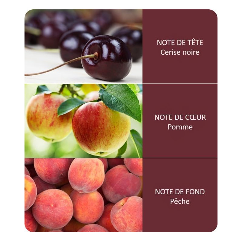 Cette alliance d’arômes de cerises noires gorgées de soleil et de fruits savoureux vous mettra l’eau à la bouche. -notes de tête : cerise noire, pomme -notes de cœur : cerise, fruits -note de fond : pêche