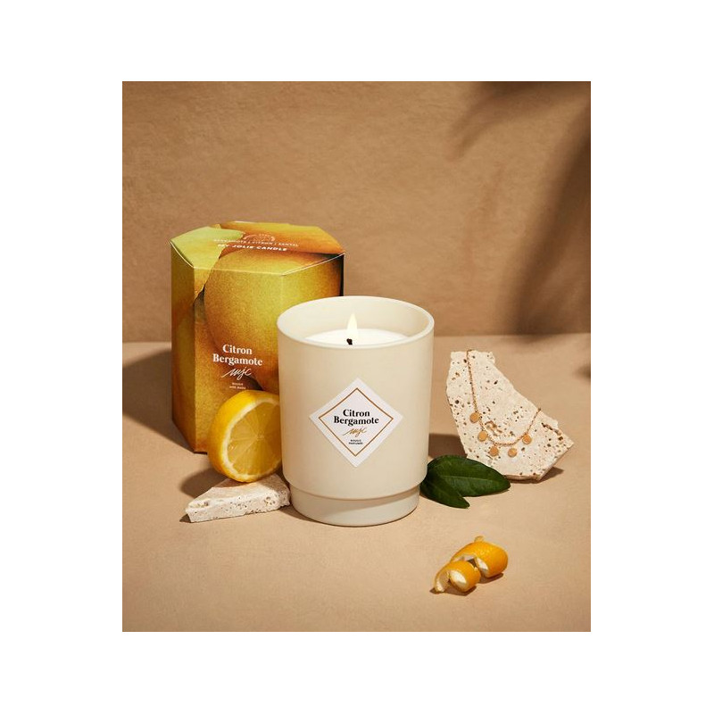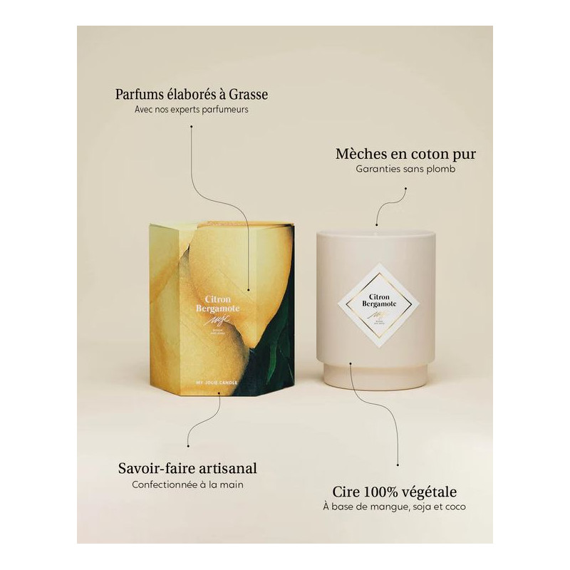 L'emballage soigné de la bougie témoigne de l'engagement de My Jolie Candle envers l'esthétique et la qualité. La "Citron Bergamote" se présente comme une œuvre d'art olfactive, où chaque détail, des couleurs vives à l'étiquette élégante, évoque la fraîcheur et la vitalité des agrumes.