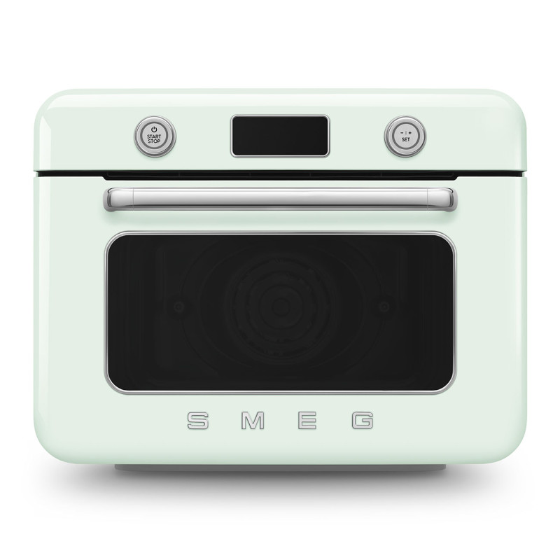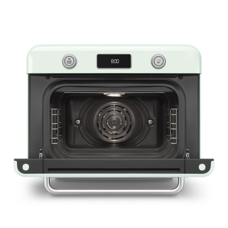 Le mini four SMEG 30L vert d'eau allie design rétro doux et performance professionnelle. Compact et puissant, il cuit pizzas, gâteaux et plats variés avec précision. Pratique et élégant, il apporte chaleur et charme vintage à votre cuisine moderne.
