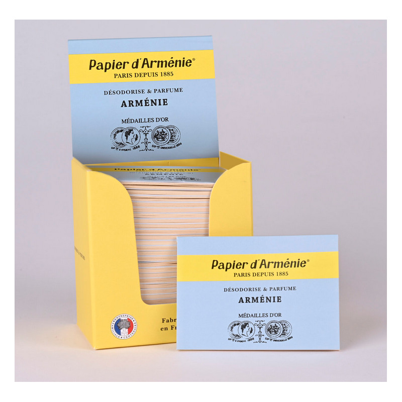 | MODE D'EMPLOI DU PAPIER D'ARMENIE | Détacher une lamelle, la plier en forme d’accordéon, la poser sur la tranche sur un support résistant à la chaleur, l’allumer puis souffler la flamme pour éviter de l’enflammer car elle doit se consumer lentement. |
