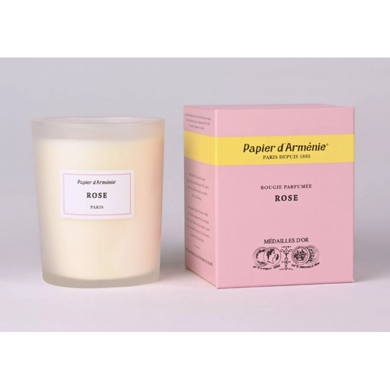 Bougie parfumée Papier d’Arménie Rose, aux notes florales et douces. Combustion longue : plus de 50 heures avec mèche coton et cire végétale. Fabrication artisanale française.