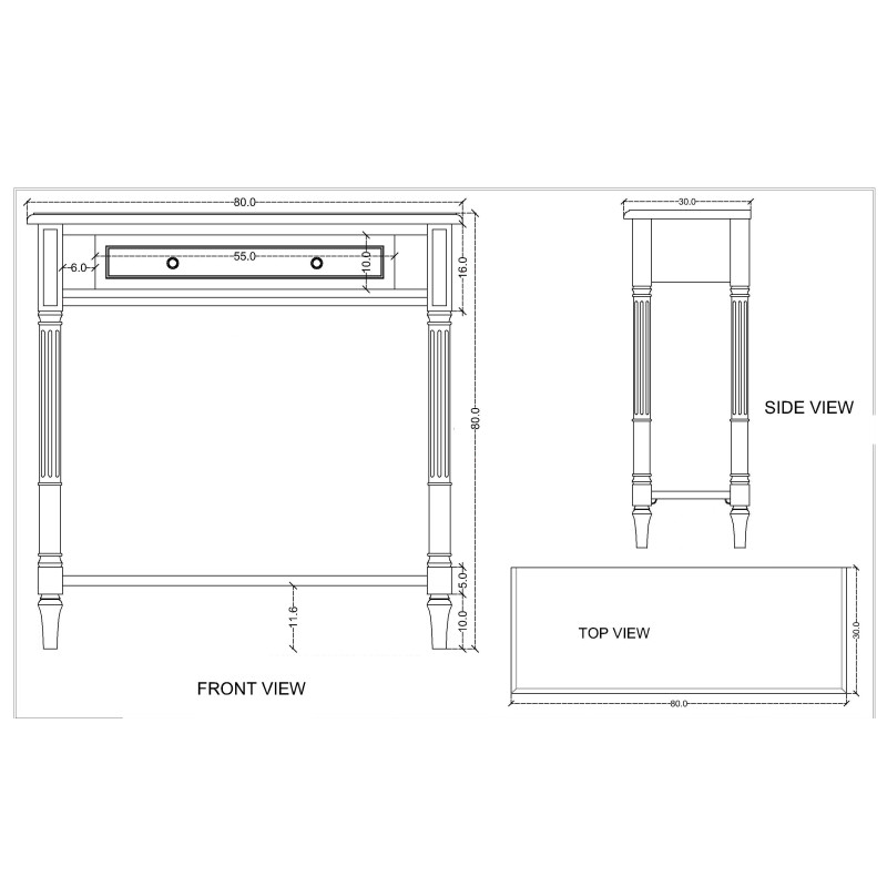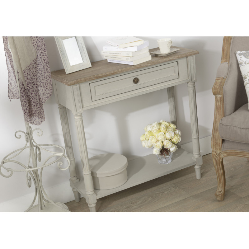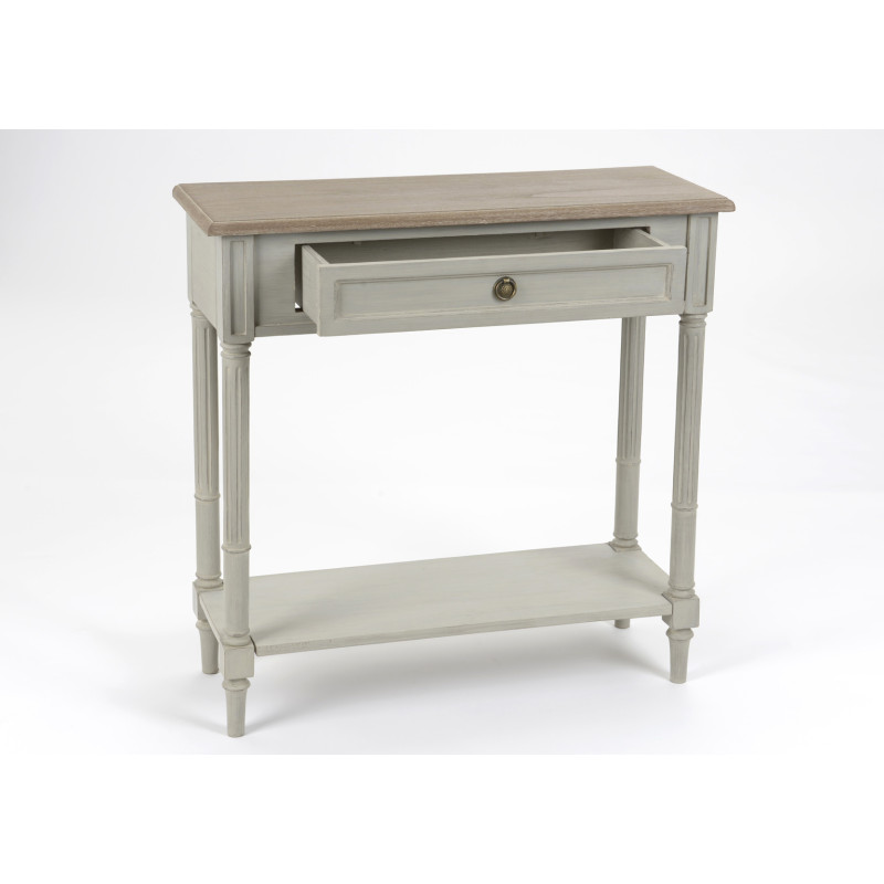 Console de dimensions compactes (80x30x80 cm) en MDF et bois massif, finition patinée gris clair et plateau bois naturel. Ce meuble d'appoint à tiroir unique et tablette basse séduit par son style classique revisité, idéal pour enrichir une gamme de mobilier d'entrée ou salon. Léger et facile à monter (kit), il offre une solution pratique et esthétique pour les espaces restreints.