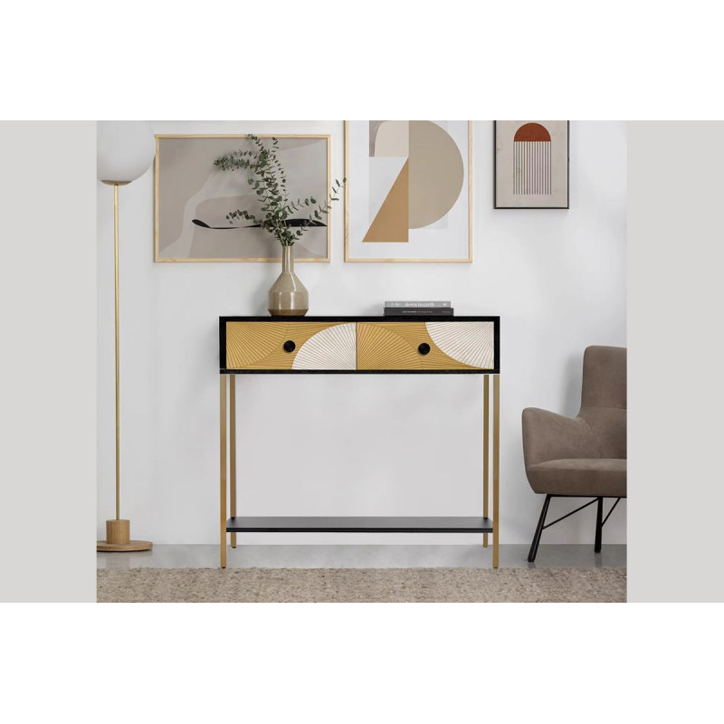 La collection MITRHA est une série de meubles aux tons chatoyants et lumineux. Les pieds dorés apportent de la légèreté au meuble et lui donnent un aspect prestigieux. Plongez-vous dans le décor pour observer un coucher de soleil. Placez cette console dans une salle afin de disposer des objets de décoration et d'habiller votre mur d'élégance. Matière : medium de bois et pin, pieds en métal.