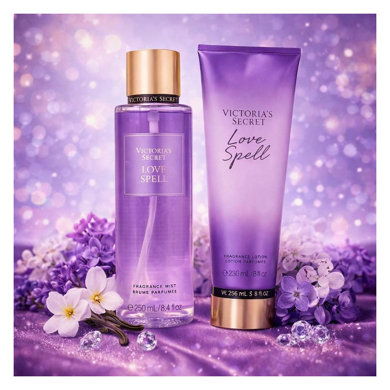Le duo Love Spell combine brume et lait corporel pour une peau douce et parfumée, avec des notes fruitées et florales qui éveillent les sens et séduisent tout au long de la journée.