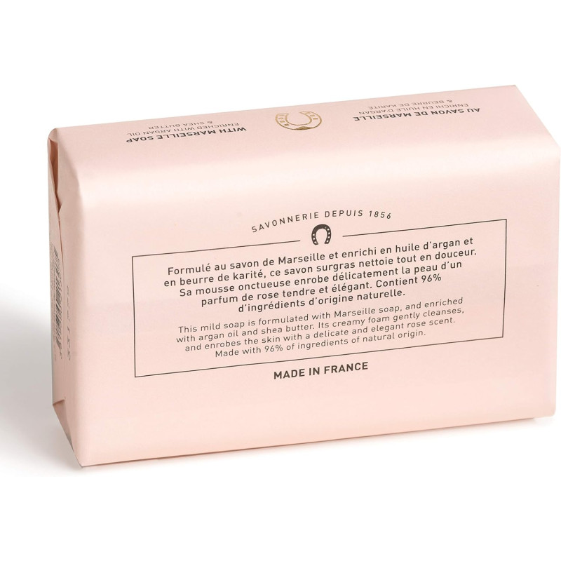 Le savon doux parfumé Pétales de Rose associe une base lavante végétale au savon de Marseille fabriqué à la savonnerie Fer à Cheval, à l’huile d’argan et au beurre de karité reconnus pour leurs propriétés nourrissantes qui aident à préserver l’équilibre de tous les types de peau. Il est idéal pour la toilette des mains et du corps. Sa mousse onctueuse et légère enrobe délicatement la peau d’un parfum de rose tendre et élégant, un classique intemporel. UN SAVON DE PROVENCE DOUX POUR LA PEAU Ce savon doux parfumé Pétales de Rose a été fabriqué pour être le plus doux pour le corps. Composé uniquement de l’authentique savon de Marseille végétal, de parfum, d’huile d’argan bio, de beurre de karité bio, d’huile de graines de tournesol et d’extraits de feuilles de romarin, le savon de Provence Pétales de Rose est formulé à 96% d’ingrédients d’origine naturelle et arbore une liste d’ingrédients courte. Notre savon de provence végétal ne contient : pas de tensioactifs ou conservateurs pétrochimiques pas d’huiles minérales pas de colorants pas de Sodium Lauryl Sulfate (SLS), pas de’ mmonium Lauryl Sulfate (ALS) pas de PolyEthylene Glycol (PEG) pas de paraben pas d’EDTA