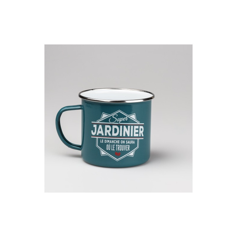 Mug (tasse) de marque Les bons gars modèle Super jardinier, le dimanche on saura où le trouver. Diamètre mug (sans la poignée) : 9.5cm. Hauteur : 8.5cm. Matière : métal émaillé. Le mug passe au lave vaiselle mais NE passe PAS au micro ondes.Contenance 475 ml