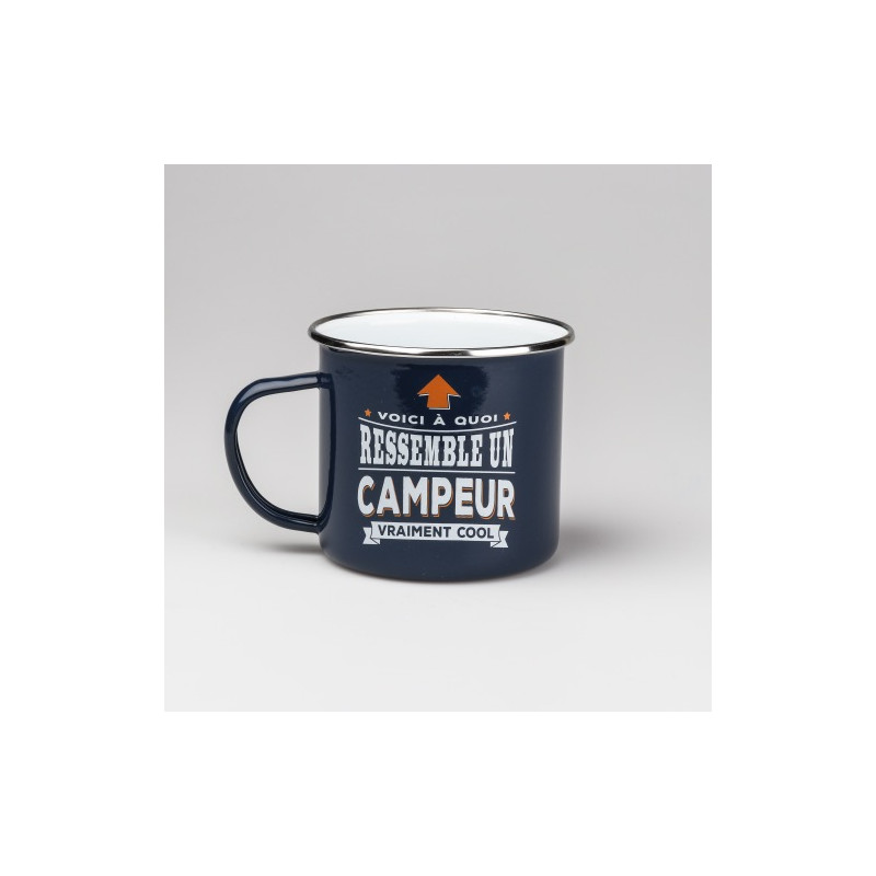 Mug (tasse) de marque Les bons gars modèle Voici à quoi ressemble un campeur vraiment cool. Diamètre mug (sans la poignée) : 9.5cm. Hauteur : 8.5cm. Matière : métal émaillé. Le mug passe au lave vaiselle mais NE passe PAS au micro ondes.Contenance 475 ml