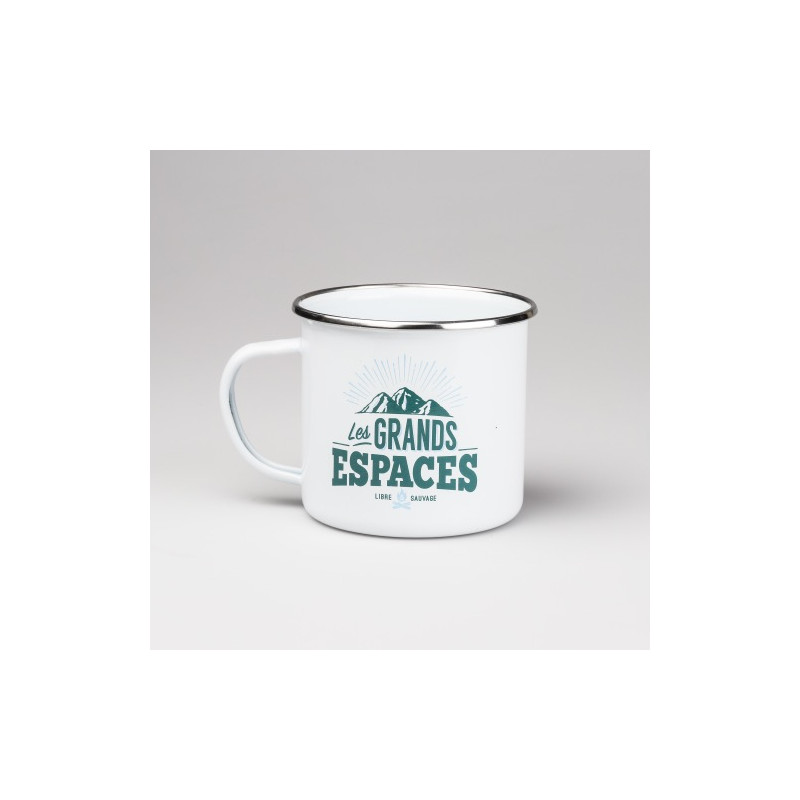Mug (tasse) de marque Les bons gars modèle les grands espaces. Diamètre mug (sans la poignée) : 9.5cm. Hauteur : 8.5cm. Matière : métal émaillé. Le mug passe au lave vaiselle mais NE passe PAS au micro ondes.Contenance 475 ml