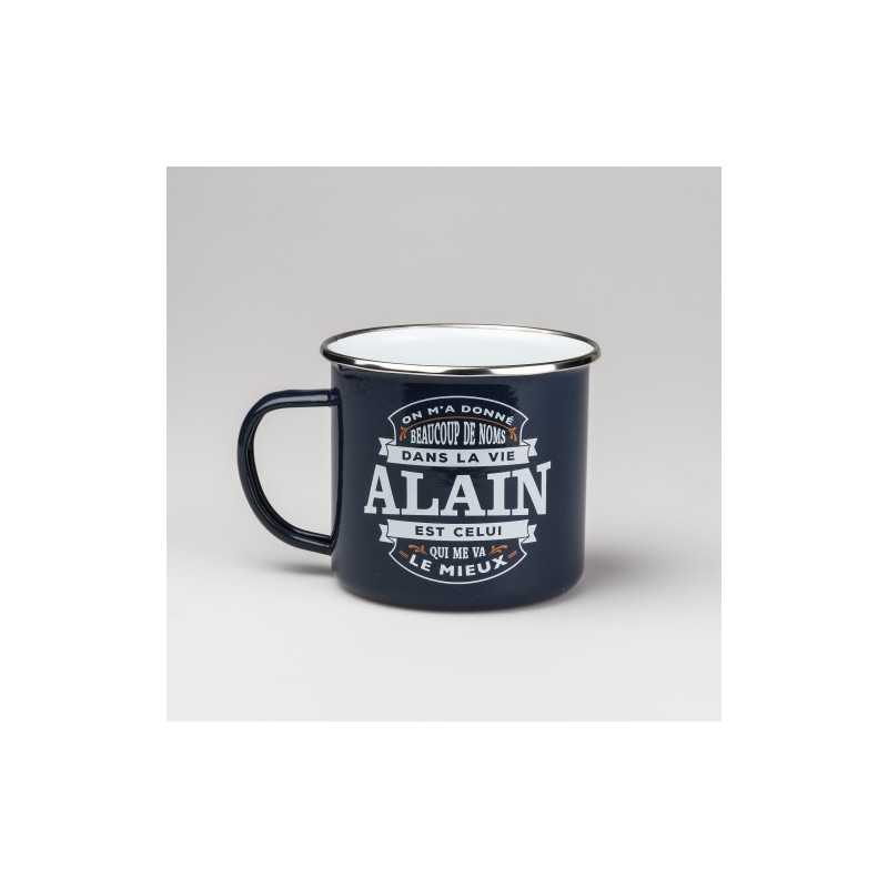 Mug (tasse) de marque Les bons gars modèle Alain,on m'a donné beaucoup de noms dans la vie,Alain est celui qui me va le mieux. Diamètre mug (sans la poignée) : 9.5cm. Hauteur : 8.5cm. Matière : métal émaillé. Le mug passe au lave vaiselle mais NE passe PAS au micro ondes.Contenance 475 ml