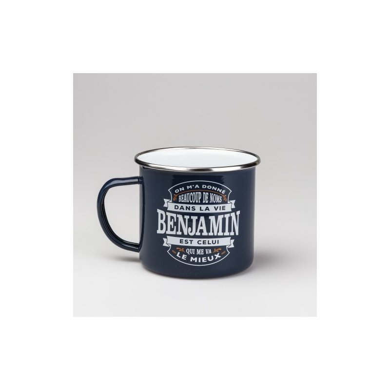 Mug (tasse) de marque les bons gars modèle Benjamin ,on m'a donné beaucoup de noms dans la vie, Benjamin est celui qui me va le mieux. Diamètre mug (sans la poignée) : 9.5cm. Hauteur : 8.5cm. Matière : métal émaillé. Le mug passe au lave vaiselle mais NE passe PAS au micro ondes.Contenance 475 ml