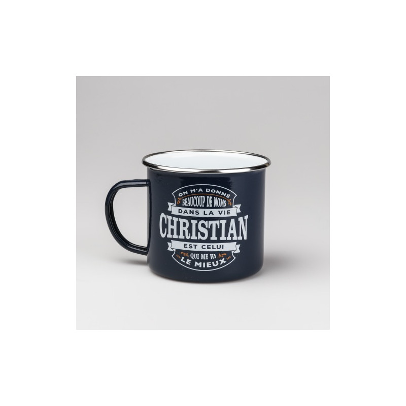 Mug (tasse) de marque Les bons gars modèle Chrisitan,on m'a donné beaucoup de noms dans la vie, Christian est celui qui me va le mieux. Diamètre mug (sans la poignée) : 9.5cm. Hauteur : 8.5cm. Matière : métal émaillé. Le mug passe au lave vaiselle mais NE passe PAS au micro ondes.Contenance 475 ml