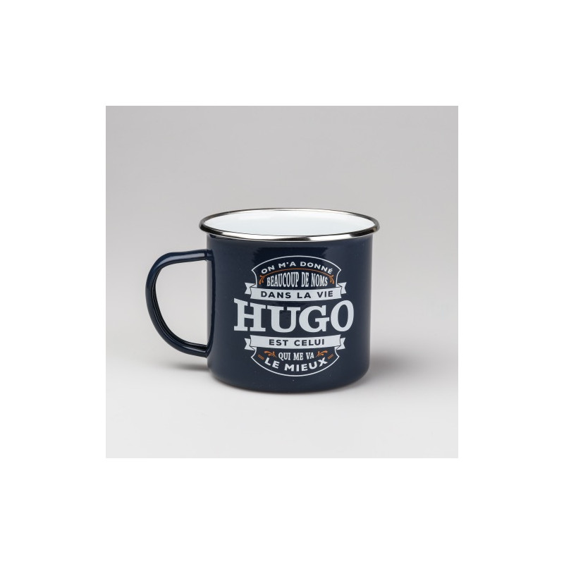 Mug (tasse) de marque Les bons gars modèle Hugo . on m'a donné beaucoup de noms dans la vie , Hugo est celui qui me va le mieux Diamètre mug (sans la poignée) : 9.5cm. Hauteur : 8.5cm. Matière : métal émaillé. Le mug passe au lave vaisselle mais NE passe PAS au micro ondes.Contenance 475 ml