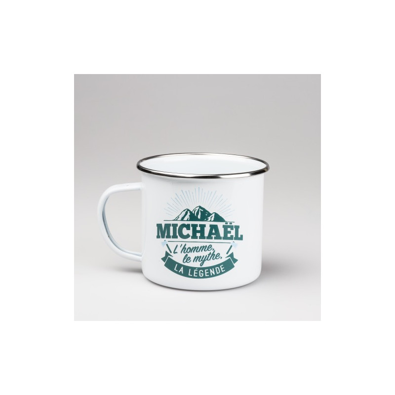 Mug (tasse) de marque Les bons gars modèle Michael, l'homme, le mythe, la légende. Diamètre mug (sans la poignée) : 9.5cm. Hauteur : 8.5cm. Matière : métal émaillé. Le mug passe au lave vaiselle mais NE passe PAS au micro ondes.