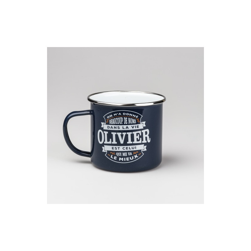 Mug (tasse) de marque Les bons gars modèle Olivier. On m'a donné beaucoup de noms dans la vie , Olivier est celui qui me va le mieux Diamètre mug (sans la poignée) : 9.5cm. Hauteur : 8.5cm. Matière : métal émaillé. Le mug passe au lave vaisselle mais NE passe PAS au micro ondes.Contenance 475 ml