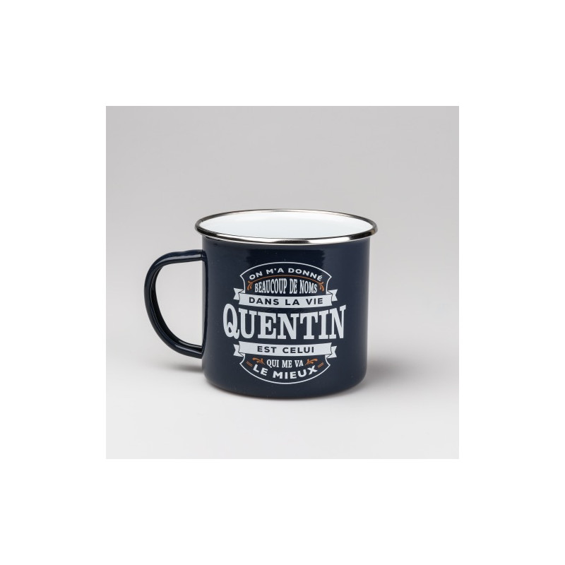 Mug (tasse) de marque Les bons gars modèle Quentin . On m'a donné beaucoup de noms dans la vie , Quentin est celui qui me va le mieux. Diamètre mug (sans la poignée) : 9.5cm. Hauteur : 8.5cm. Matière : métal émaillé. Le mug passe au lave vaisselle mais NE passe PAS au micro ondes.Contenance 475 ml